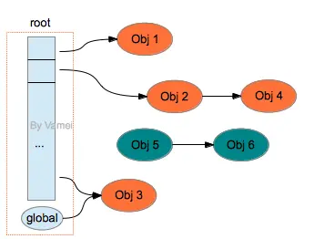 实现思想:我们将栈定义为root,遍历栈中所有的对象的引用,再遍历一遍堆中的对象。因为栈中的对象的引用执行完毕就删除,所以我们就可以通过栈中的对象的引用,查找到堆中没有被指向的对象,这些对象即为不可到达对象,对其进行垃圾回收。