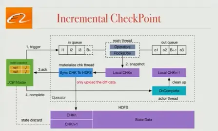 在Flink中,Checkpoint操作分为两个阶段:在本地获取状态快照,然后将状态快照保存到HDFS(或另一个存储系统),并且每个快照的整个状态存储在HDFS中。我们的状态数据太大了,这种方法是不可行的,所以Blink只存储修改的状态在HDFS中,这能够大大提高Checkpoint的效率。这种修改使我们能够在生产环境中使用很大的状态数据。