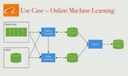 在这部分中Flink有两个应用场景。首先,我们来讨论它在商品特征实时更新中的应用。阿里巴巴搜索排序中使用的一些商品特征包括商品CTR,商品库存和商品点击总数。这些数据随时间而变化,如果可以使用最新的数据,我们就能为用户提供更相关的搜索结果排序。Flink pipeline为我们提供在线特征更新,并大大提高了转化率。