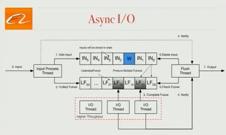 我们的job在生产环境中很大瓶颈在访问外部存储器上,如HBase。为了解决这个问题,我们引入了异步I/O,我们将致力于为社区做出贡献,并在FLIP-12中有详细描述。