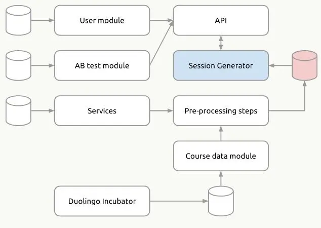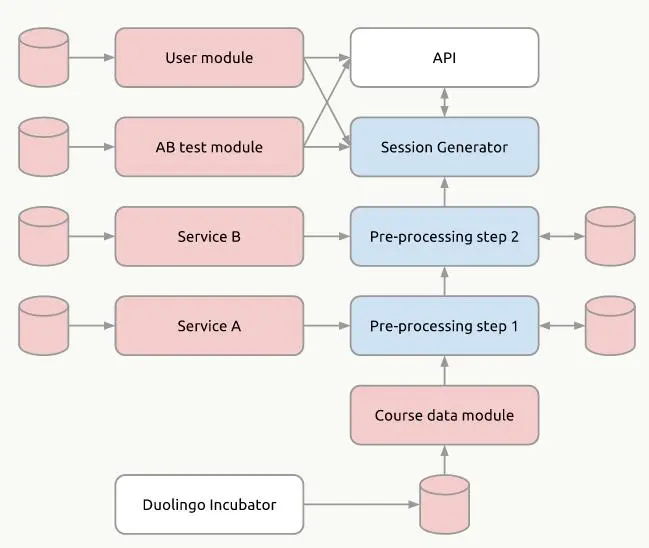 在系统设计之初,由于经常需要共享数据,Duolingo的系统架构如下图所示: