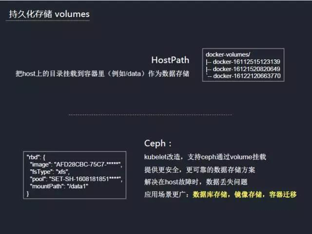 在传统游戏里,更多的是有状态的服务会涉及到数据的存储,我们通过 Docker 的 volume 提供持久化存储。最开始我们采用 HostPath 方式,把 host 上的目录挂载到容器里(例如 /data )作为数据存储。这种做法非常方便、简单,无需额外的支持,但数据的安全性、可靠性方面比较差。所以我们采用了另外一种方案,即 Ceph 。改造 kubenetes 支持 ceph ,通过 volume 挂载,提供更安全、更可靠的数据存储方案。解决在 host 故障时,数据丢失的问题,应用场景也变得更加广泛,包括数据库存储,镜像存储,容器迁移等。