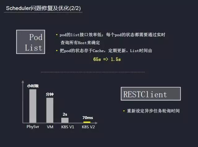 还有一点就是 RESTClient 。在 kubernetes 中, rest API 大部分是异步进行,对于这些异步的接口的请求,并不会立刻返回结果。这里有一个轮询检测状态的逻辑,在检测轮询的时候有几秒的休眠,然后进再行下一个轮询。默认的休眠时间是 2 秒,这个时间对大部分场景来说有点过长,我们通过一些功能点的调整,从物理机的小时级到虚拟机分钟级的调度,再到还未调整之前的秒级调度,到现在达到的毫秒级调度,现在的调度能力已能满足游戏的需求。