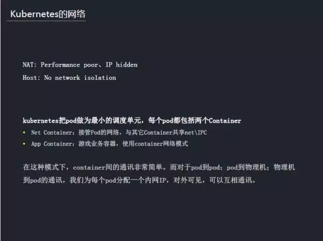 先来说, Docker 的网络还有 kubernetes 的网络。对于 Docker 的 NAT 网络来说,性能是最大的瓶颈,同时它与物理机或虚拟机的通信路径不一致也会对业务带来一些未知的影响。比如,外界不能看到容器真实的 IP(必须要使用主机 IP+port 方式,端口本身就是稀缺资源,并且 ip+port 的方式,无疑增加了复杂度), TGW 仍然可以为业务程序服务。 Host 模式没有隔离,也不符合需求。在 kubernetes 中, pod 作为最小调度单元,每个 pod 有两个容器,一个就是网络容器,接管 pod 的网络,提供网络服务,并与其它容器共享 net\IPC 。另一个是 App Container ,也就是业务容器,使用第一个网络容器的网络。在这种模式下,容器之间的通讯是非常简单的。对于 pod 到 pod 、 pod 到物理机、物理机到 pod 的通讯,我们为每个 pod 分配一个内网 IP ,对外可见,也可以互相通讯。