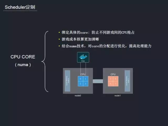 在社区中, CPU 的分配用的是共享 CPU 的方式,游戏采用的是一种混部的模式。也就是说,将不同游戏业务部署到同一台母机,采用绑定核的方式。这样做一方面可以防止不同游戏之间的 CPU 抢占,另一方面对游戏成本的核算也会更加精细。例如,某个游戏用了多少 CPU 这些指标都是可以量化的。在容器分配 CPU 时,结全 numa 技术,对于 CPU CORE 的分配会尽量地分配到同一个 numa node 上,这样可以提升性能,因为同个 numa node 的 CPU 访问只需通过自身的 local memory ,无需通过系统总线。