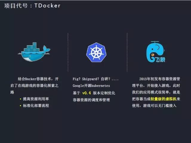 在 2015 年初的时候, TDocker 平台上线。之后,我们开始逐步接入业务。一开始的模式非常简单,就是把 Docker 当成虚拟机来使用,但这不意味着游戏全容器化的实现。