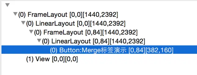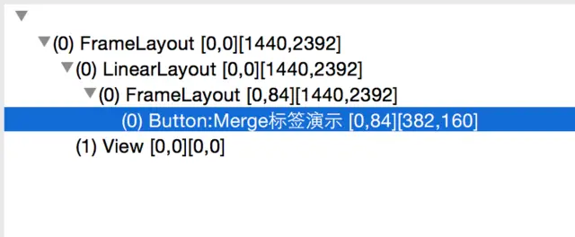 可以看到使用Merge标签进行优化之后布局嵌套就少了一层,Button作为父视图第三层FrameLayout的直接子视图。