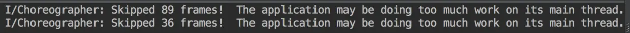 - Misc Time/Vsync Delay:表示在主线程执行了太多的任务,导致UI渲染跟不上vSync的信号而出现掉帧的情况;出现该线条的时候,可以在Log中看到这样的日志: