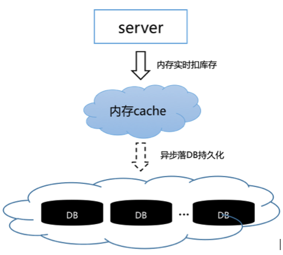 如图2所示,将“实时扣库存”的行为上移到内存Cache中操作,内存Cache操作成功直接给Server返回成功,然后异步落DB持久化。