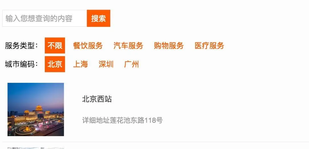 // 初始化搜索插件 var search = new CdList.addons.Search({ historyEnable: 1, placeholder: '输入您想查询的内容' }); // 初始化分页插件 var pg = new CdList.addons.Pagination({ historyEnable: 1, onChange: function () { $('body, html').animate({ scrollTop: $('.cdlist-container').offset().top }, 300); }, getSetting: function (json) { return { total: parseInt(json.count / 13) } } }); // 初始化筛选插件 var filter = new CdList.addons.Filter({ historyEnable: 1, line: 1, filters: [ { label: '服务类型:', name: 'types', datas: [ { name: '不限', value: '' }, { name: '餐饮服务', value: '05' }, { name: '汽车服务', value: '01' }, { name: '购物服务', value: '06' }, { name: '医疗服务', value: '09' }, ] }, { label: '城市编码:', name: 'city', datas: [ { name: '北京', value: 'beijing' }, { name: '上海', value: 'shanghai' }, { name: '深圳', value: 'shenzhen' }, { name: '广州', value: 'guangzhou' }, ] } ] });-