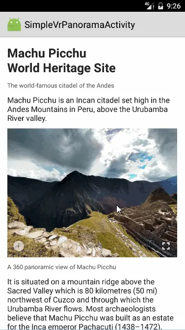 simplepanowidget展示了印加文明遗迹马丘比丘的全景图(Panorama)