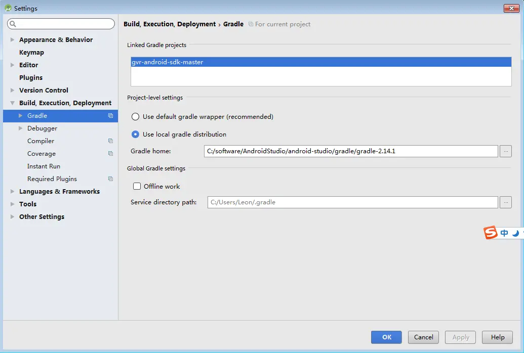导入gvr-android-sdk到Android Studio, 同步的过程中需要下载很多库所以会比较耗时,另外可能出现build失败的情况,这时可以尝试使用本地的gradle来编译。