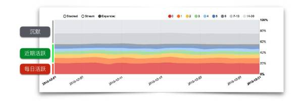 「活跃用户池」模型,按照用户下载 App 后的使用情况,分级为每日活跃、近期活跃、沉默。右上角的数字代表上次使用距离今天的日期。0 代表用户今天使用过 App。