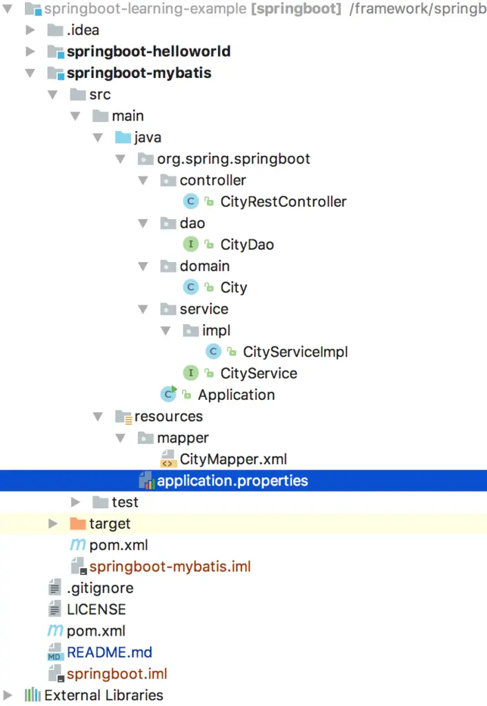 org.spring.springboot.controller – Controller 层 org.spring.springboot.dao – 数据操作层 DAO org.spring.springboot.domain – 实体类 org.spring.springboot.service – 业务逻辑层 Application – 应用启动类 application.properties – 应用配置文件,应用启动会自动读取配置3.改数据库配置打开 application.properties 文件, 修改相应的数据源配置,比如数据源地址、账号、密码等。(如果不是用 MySQL,自行添加连接驱动 pom,然后修改驱动名配置。) 4.编译工程 在项目根目录 springboot-learning-example,运行 maven 指令: