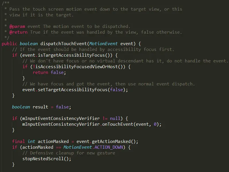 事件传递给当前View一定会执行这个方法,返回结果与View的onTouchEvent和下级View的dispatchTouchEvent有关,表示是否消耗当前的事件。