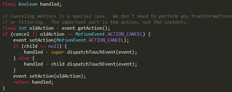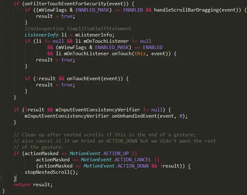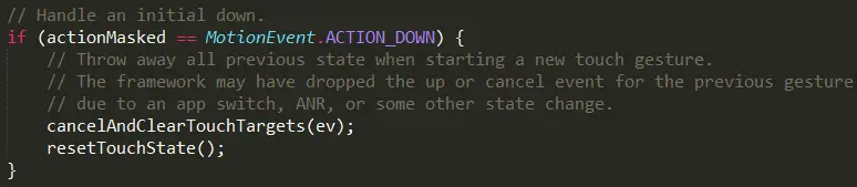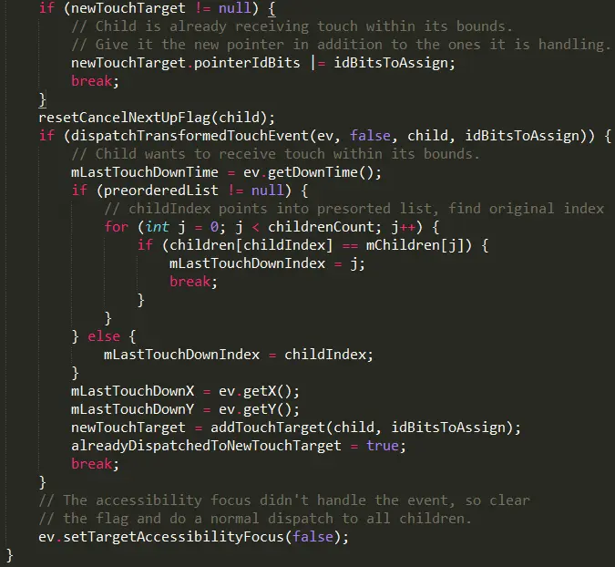 上面代码说明了ViewGroup会在ACTION_DOWN事件到来之前重置标记位的状态。当ViewGroup不再拦截事件的时候,事件就会下发至它的子View处理。源码如下所示