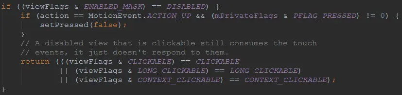 接下来分析onTouchEvent,这里面主要分三个过程 : View处于不可用状态,View设置有TouchDelegate,View处于可用状态。