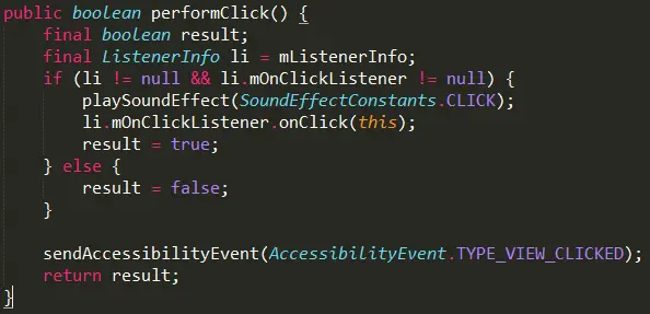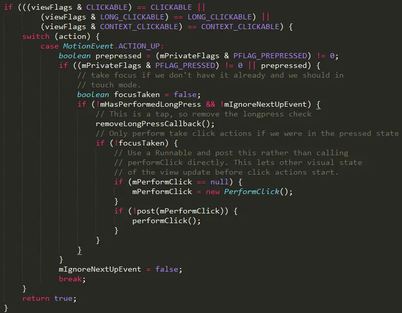 只要View的CLICKABLE或LONG_CLICKABLE为true,就会消耗这个事件,并返回true,然后触发performClick方法,如果View设置了onClick事件,那么onClick就会被调用。