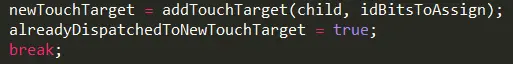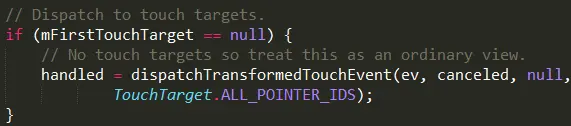 如果子元素不为空,直接调用它的dispatchTouchEvent方法,如果返回true,那么mFirstTouchEvent会被赋值并且跳出循环。如果返回false,ViewGroup会把事件分发给下一个元素,