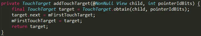 当ViewGroup的子元素成功处理时,mFirstTouchTarget会被赋值,并指向子元素,即当ViewGroup不拦截事件并交给子元素处理时mFirstTouchTarget != null。