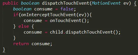 对于根ViewGroup来说,点击事件首先会传给它,此时调用它的dispatchTouchEvent方法,然后执行onInterceptTouchEvent 方法,如果该方法返回true,表示它要拦截该事件,然后事件就会交给ViewGroup处理,然后它的onTouchEvent 方法就会被调用,如果返回false表示它不拦截当前事件,这时事件就会传递给它的子元素,接着调用子元素的dispatchTouchEvent方法,如此反复直到事件被处理。