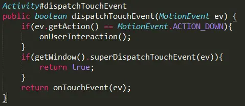 当产生点击事件后,总是先传递给Activity,再传递给Window,最后传递给顶级View,然后按照事件的传递规则去分发事件。如果所有View都不处理这个事件,那么这个事件最终会传递给Activity处理,Activity的onTouchEvent方法会被调用。