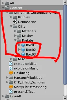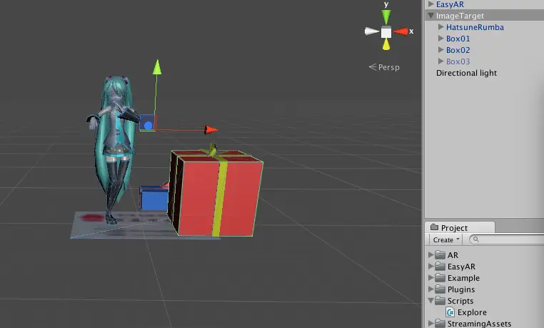 我们将准备好的资源--礼物与二次元女生导入到unity中,并将三个礼物盒子与女主角拖入到ImageTarget 充当子物体,礼物盒的模型位置在