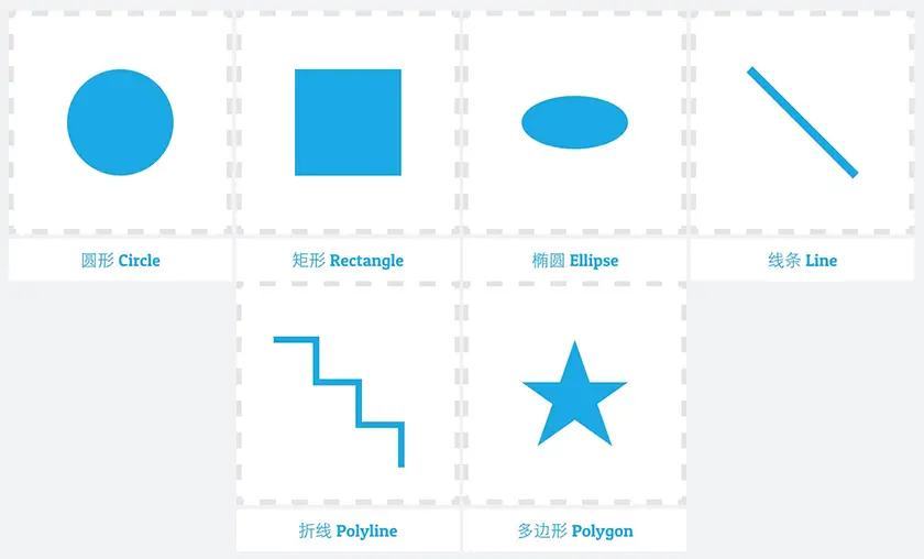 SVG 有6种基本图形:矩形、圆形 、椭圆、线条、折线、多边形。还有另外一种:路径(path),path 是最复杂的一种绘图方式,它可以绘制复杂的图形——当然6种基本图形也不在话下。而关于基本图像与 path 之间的转换,可以参考本站的另外一篇文章: 聊聊 SVG 基本形状转换那些事。