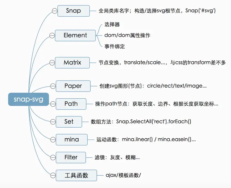 从主要功能上说,Snap.svg.js 是一个操纵 SVG 节点/制作 SVG 动画的框架,简单点理解可以看下面文字:
