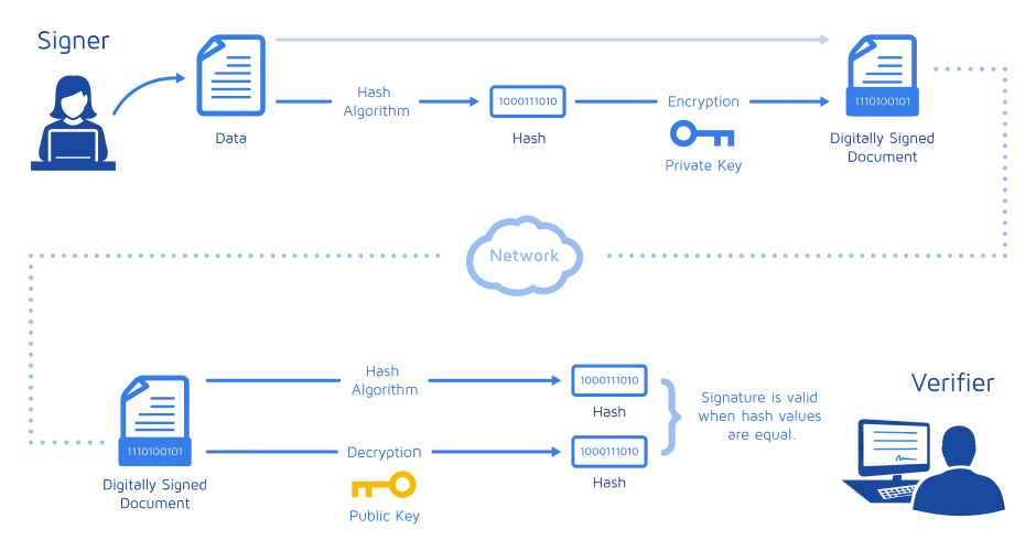 第三步:对签名进行验证,验证的过程是先把消息提取出来做同样的Hash处理,得到消息摘要,再与 Alice 传过来的签名用公钥解密,如果两者相等,就表示签名验证成功,否则验证失败,表示不是 Alice发的。