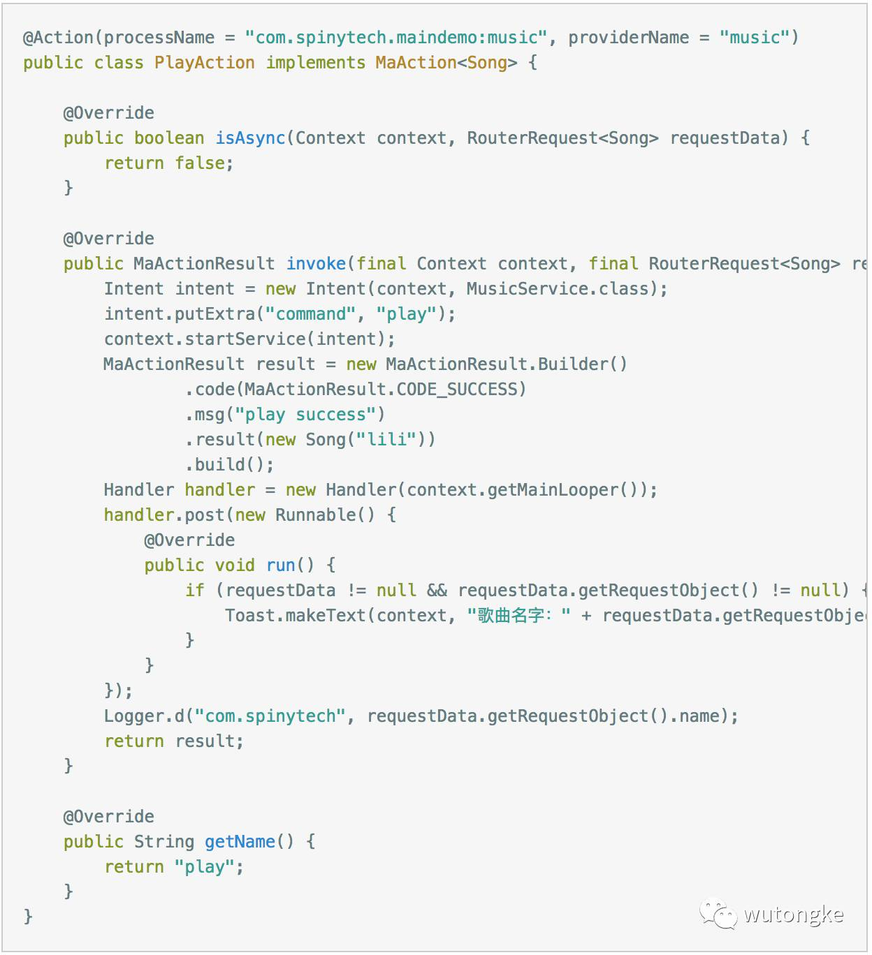 可以通过RouterRequestUtil的obtain方法快速建立请求,上例中请求的Action位于”com.spinytech.maindemo:music”进程,Provider是”music”,Action是”play”,并且传递了相应的参数new Song(“see you”)。