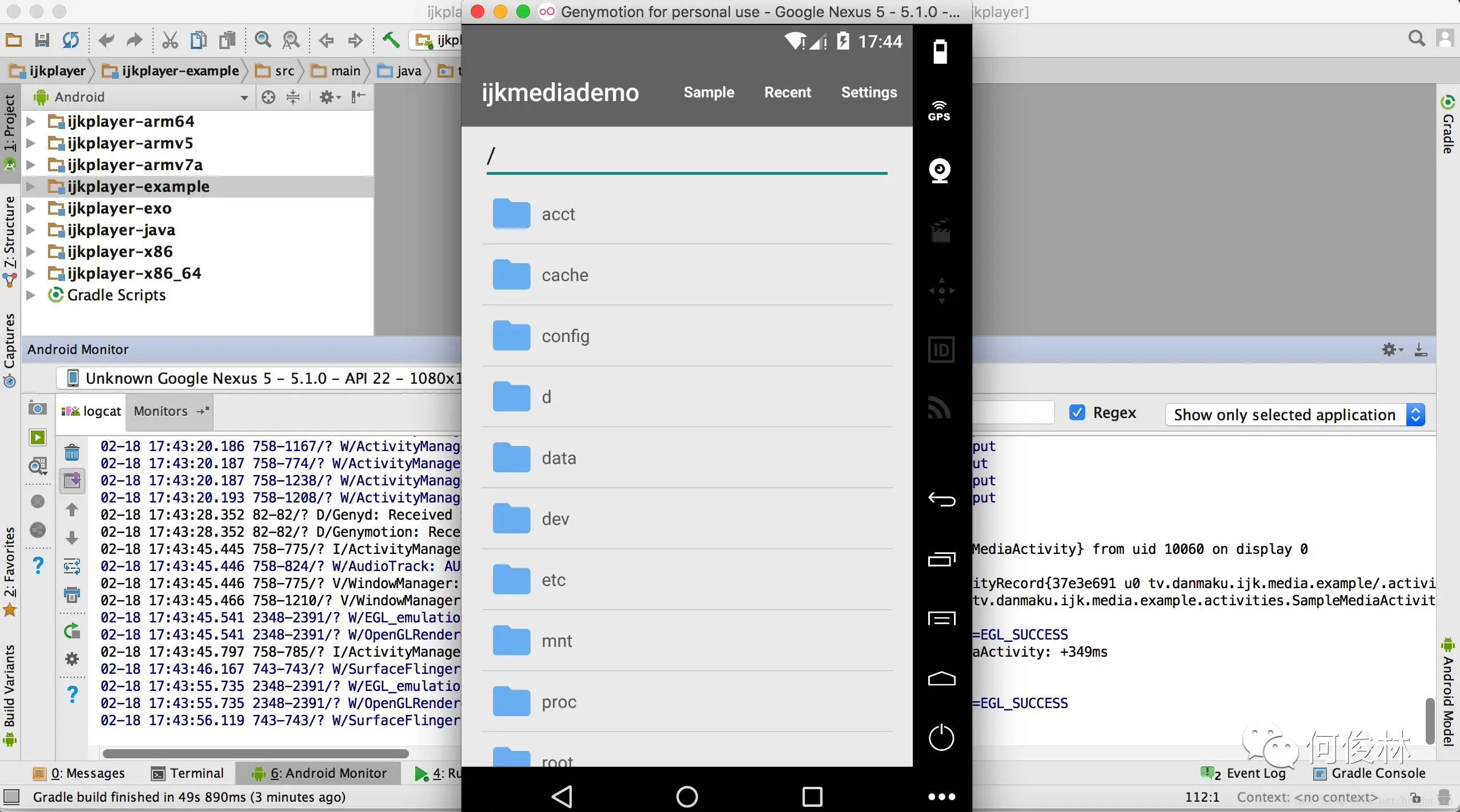执行完毕后,就会出现一个ijkplayer文件夹,为studio工程,里面包含各平台so库。导入android studio,就可以运行demo工程。