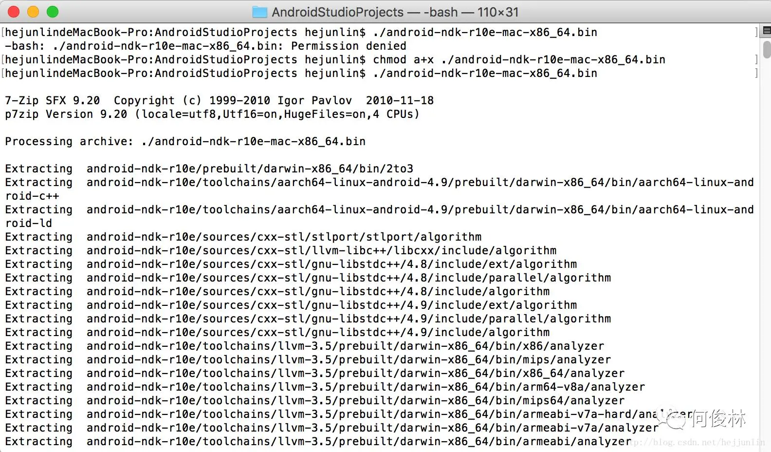 这时要改下权限,执行命令 chmod a+x ./android-ndk-r10e-mac-x86_64.bin