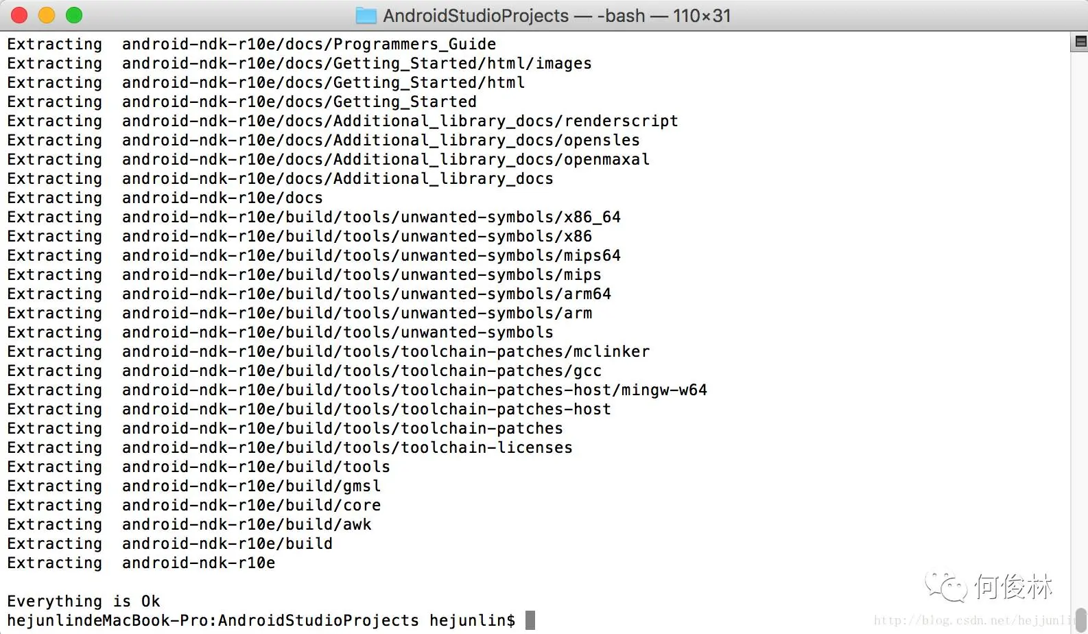 用命令 ./android-ndk-r10e-mac-x86_64.bin,就可进行进行解压,如下图: