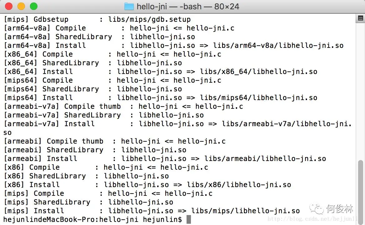 找到ndk-10e中sample目录,cd hello-jni中,执扫命令ndk-build。就会出现如下所示: