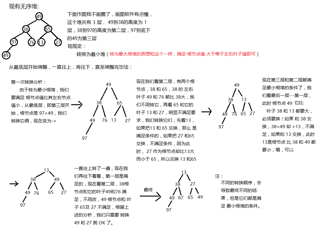 这类要求一半出现在笔试选择题,注意:无序堆调整为最小根堆或者最大根堆的最终结果,是会因调整过程中的顺序不同而不同的,我的建议是,从最底层开始调整,一直往上,再往下,直至调整完毕。下面我通过一个例子以图片方式来进行讲解。