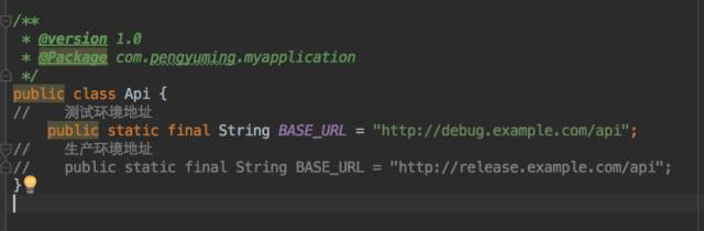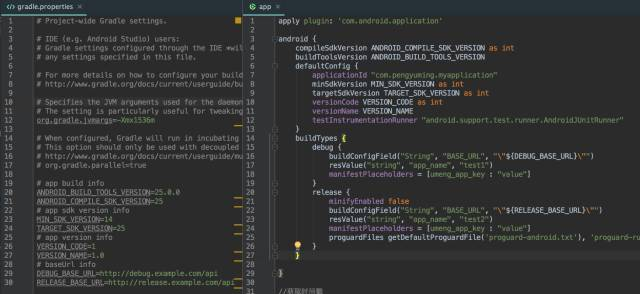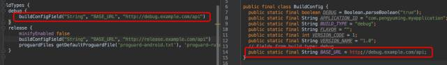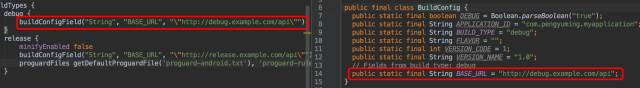 自SDK工具版本升级到17之后,构建工具都会生成一个叫作BuildConfig的类,该类包含一个按照构建类型设置值的DEBUG常量,可以定义其他的一些属性,Gradle提供了一个buildConfigField 方法 ,下面就是顶一个String类型的BASE_URL常量,值为"http://debug.example.com/api”。