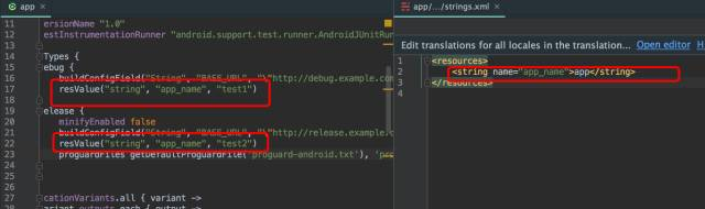 同样的Gradle也提供了一个resValue() 方法,下面就是定义了一个app_name的string资源。