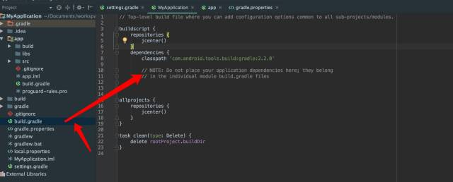 在对工程进行配置(譬如多项目树构建)时Settings实例与settings.gradle文件一一对应,它用来进行一些项目设置的配置。这个文件一般放置在工程的根目录。譬如:
