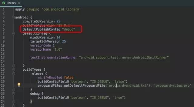 在这里还有一个问题,如果开发的是一个多模块项目,那么在library中定义这种属性,默认是不区分debug和release版本的。缺省情况下,无论你选用什么Build variant ,库工程都只会打出release包,这是由于Gralde语言的限制造成的,但如果想强制使用debug,可以如下指定: