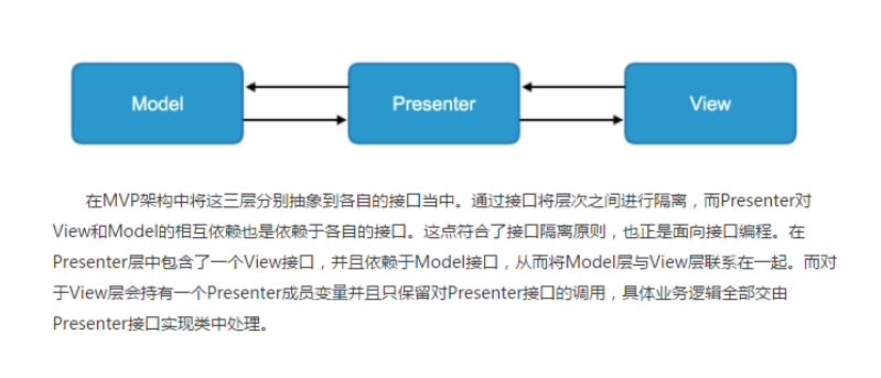 - MVP是面向接口编程,也就是说用户不必知道我是具体如何实现额,用户只要知道有这个功能,直接调用即可。
