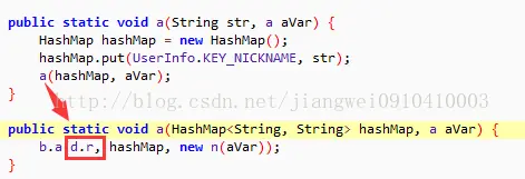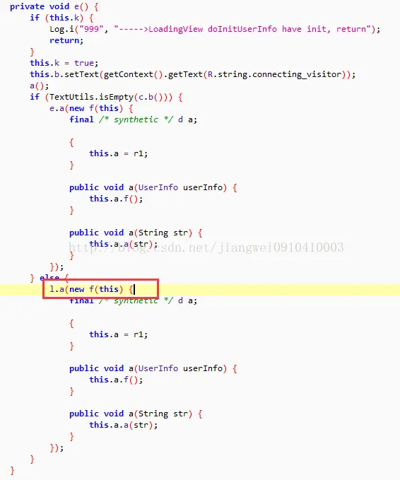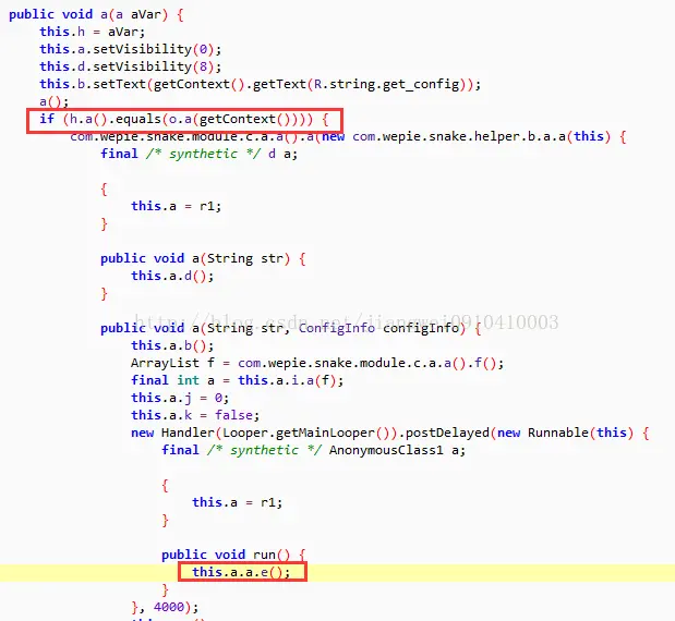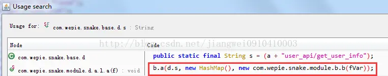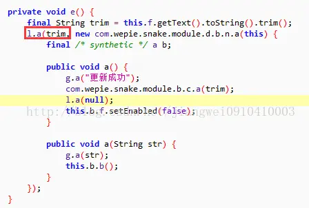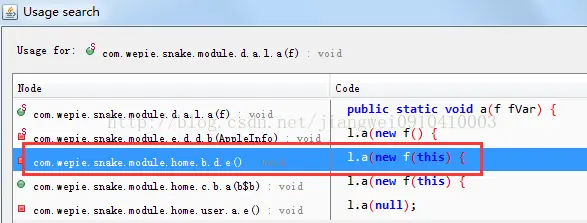 这里有四个地方调用这个方法,但是可以依次排除,最终定位到是com.wepie.snake.module.home.b.d.e()方法,那么下面来看一下如何进行排除的,可以从下往上排除,看最下面一个方法: