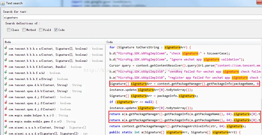 第一步:先在Jadx中打开应用之后,全局搜字符串内容:"signatures",这个就可以定位到获取应用签名信息的地方了,然后可以依次跟踪校验的地方了。