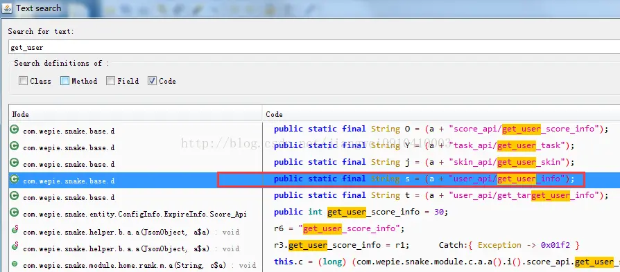 这个是没有二次打包签名的请求信息,和上面二次打包签名之后的请求相比较,多了很多请求,可以发现有一个get_user_info这个接口比较特殊,所以我们可以去Jadx全局搜这个请求接口: