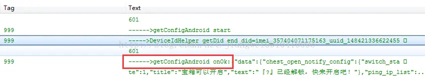 这里可以看到,有一个设置进度条的逻辑,而且有一个tag=999的日志,貌似是取配置信息的进度条,那么我们可以查看这个日志信息: