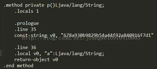 把这个方法直接返回"678a930b9829b54a44f92a840916f7d1"字符串即可。有的同学说这个怎么改?是手动编写samli代码吗?肯定不是的,咋们可以先写一个简单的返回这个字符串的方法,然后反编译得到这段smali代码就可以了,可千万别自己手动的去编写,除非你有这个耐心和毅力,反正我没有。替换完成之后,咋们就回编译,二次签名运行安装游戏,可惜的是还是卡住了,所以还得回去看代码: