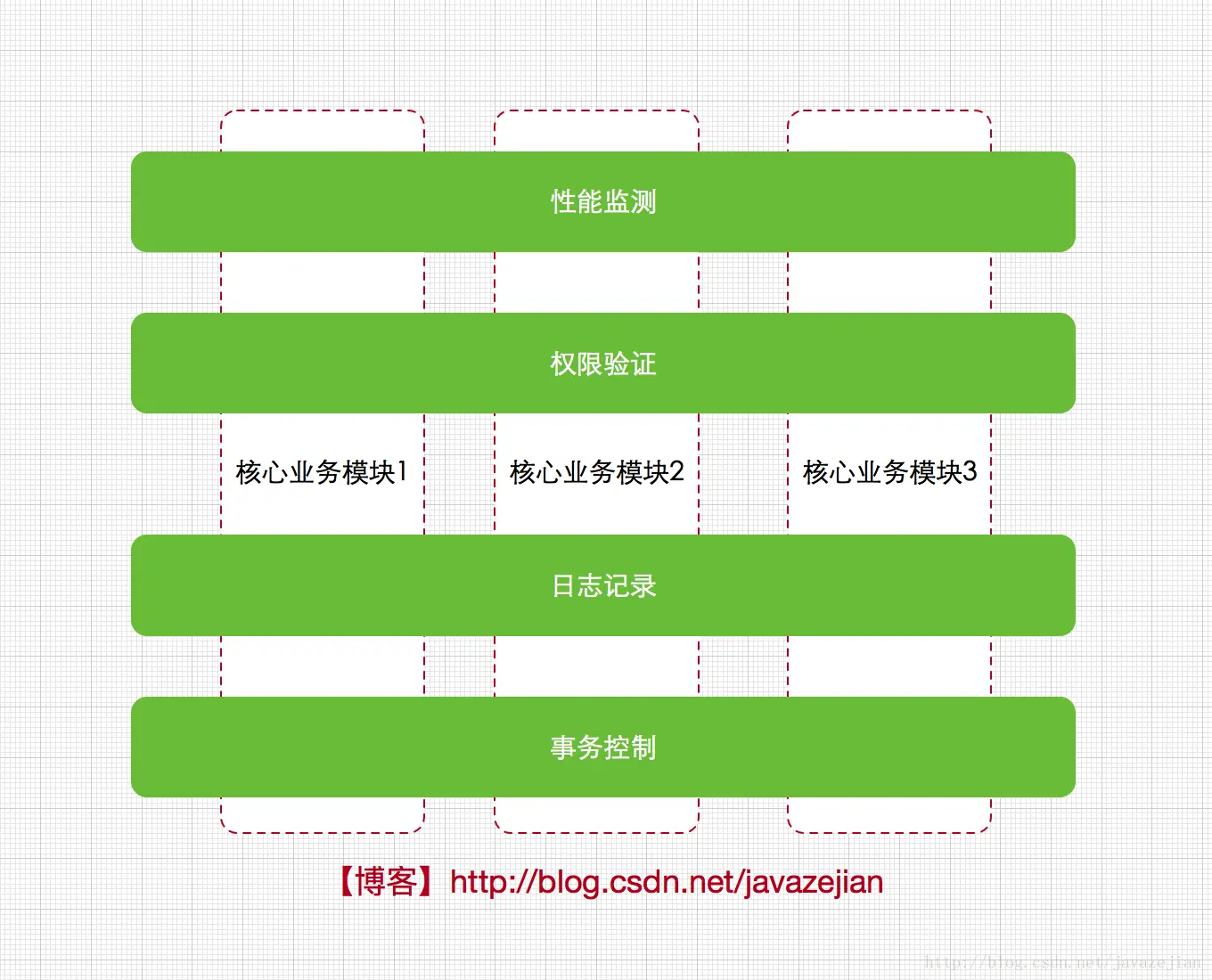 显然前面分析的两种解决方案已束手无策了,那么该如何解决呢?事实上我们知道诸如日志,权限,事务,性能监测等业务几乎涉及到了所有的核心模块,如果把这些特殊的业务代码直接到核心业务模块的代码中就会造成上述的问题,而工程师更希望的是这些模块可以实现热插拔特性而且无需把外围的代码入侵到核心模块中,这样在日后的维护和扩展也将会有更佳的表现,假设现在我们把日志、权限、事务、性能监测等外围业务看作单独的关注点(也可以理解为单独的模块),每个关注点都可以在需要它们的时刻及时被运用而且无需提前整合到核心模块中,这种形式相当下图: