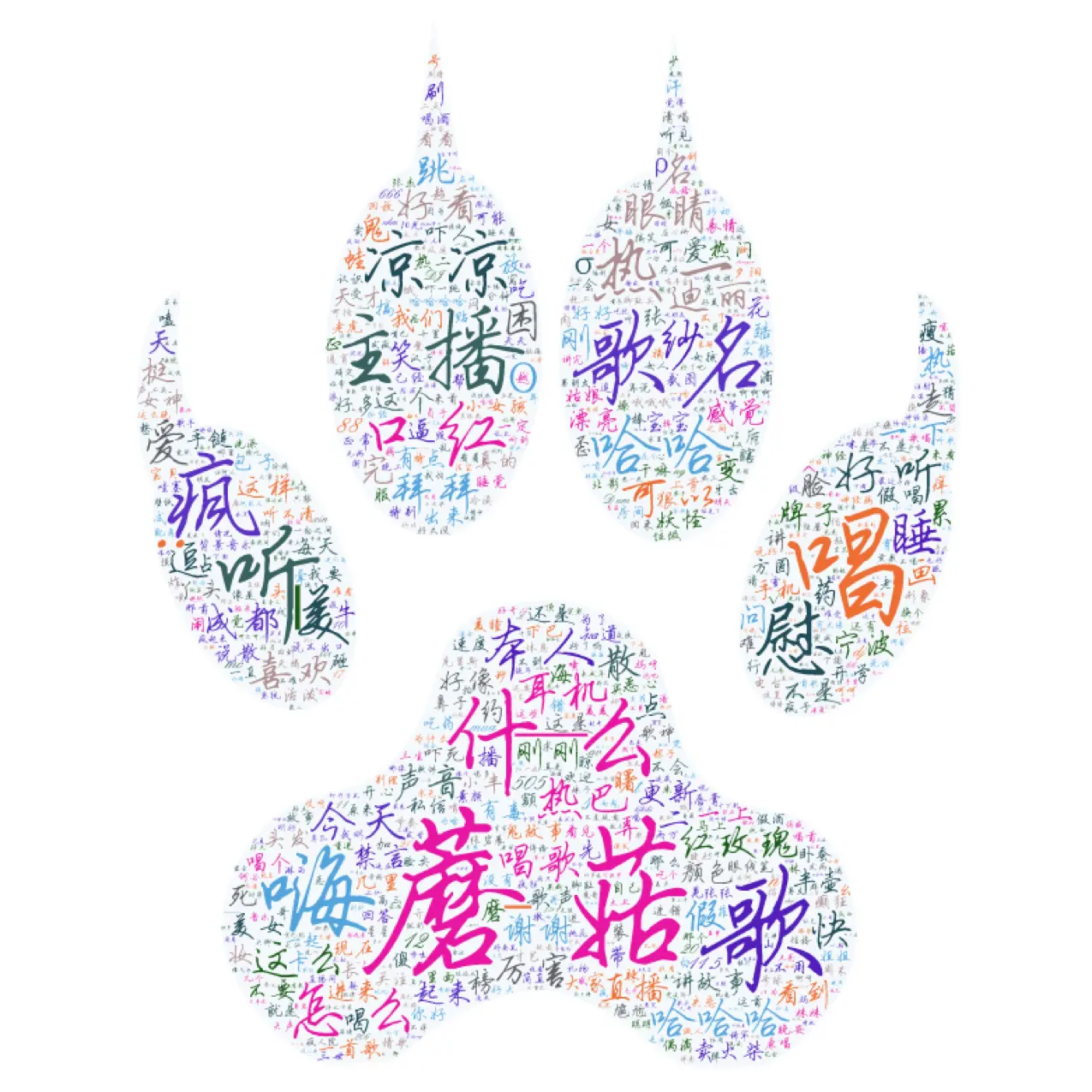 蘑菇这个词的词频最高,因为主播的昵称蘑菇哥哥 中包含了这个词。其他的热词包括歌名、唱、嗨、疯等,说明主播的风格是比较活泼的。