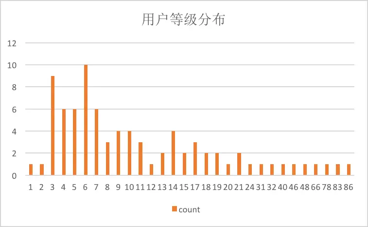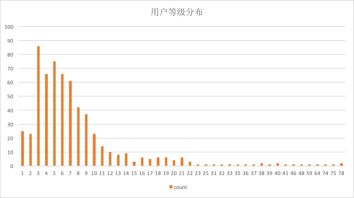 可见大部分用户都是初级玩家,有极少量的高级用户,这个规律也符合幂律分布。
