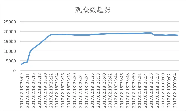 从观众数趋势中可以看出开播后大概10分钟,观众数就迅速增长到1万8千人左右,并稳定在这个水平一直到直播结束。